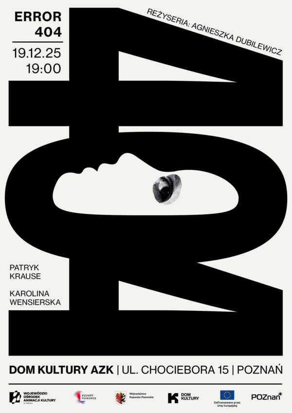 ERROR 404 – performatywne działanie w technice butoh – rozsadza granice, zawiesza normy i prowadzi w liminalną przestrzeń, gdzie różnice spotykają się, odbijają od siebie, prowokują, czasem ranią. Ciała performerów, pogrążone w półmroku, stają się pulsującą mapą stanów wewnętrznych, a każdy ruch jest śladem, który znika i natychmiast powstaje na nowo.